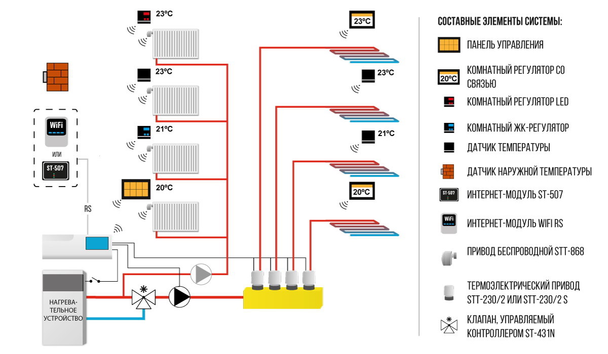 Датчики Tech C-mini устанавливаются в отдельных, контролируемых помещениях (зонах). После получения информации о текущей температуре в помещении от датчиков, монтажная планка подаёт сигнал (напряжение 230В) на термоэлектрические приводы, которые расположены на распределительном коллекторе напольного и/или радиаторного отопления. При подаче напряжения – термоэлектрические приводы открываются и в контур(а) поступает горячая вода, соответственно повышается температура в помещении.