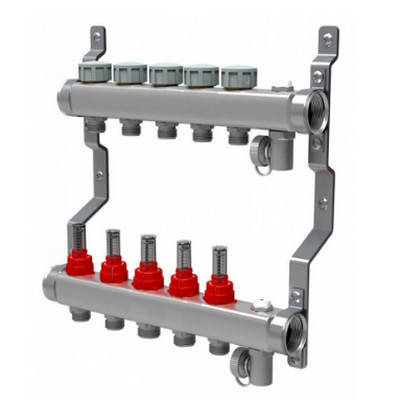 - Оснащена 5 расходомерами на каждом контуре, позволяя визуально контролировать и регулировать расход теплоносителя для обеспечения равномерного распределения тепла по всей площади пола.