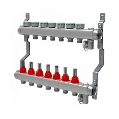 - Оснащена 7 расходомерами на каждом контуре, позволяя визуально контролировать и регулировать расход теплоносителя для обеспечения равномерного распределения тепла по всей площади пола.