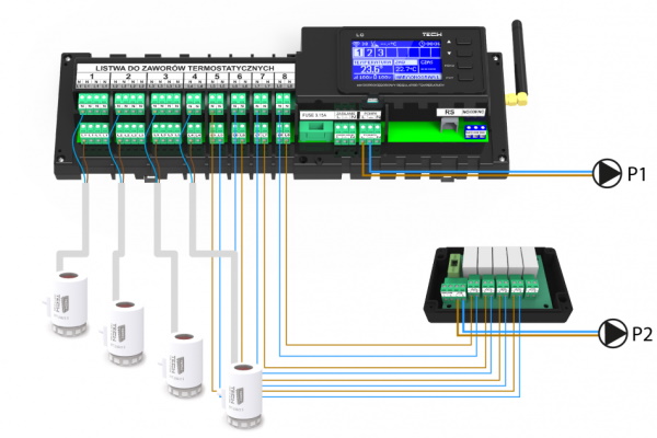 При работе с одной монтажной планкой интегратор выходов Tech ST-513 может управлять дополнительным насосом на основании данных с терморегуляторов, находящихся в нескольких помещениях.
