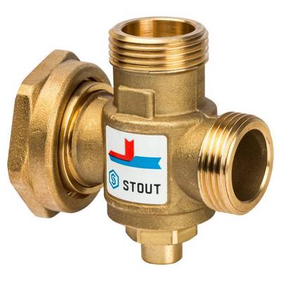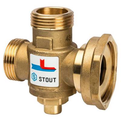 Термостатический смесительный клапан Stout имеет два входных штуцера для подвода смешиваемой среды и один выходной. В клапан встроен термостатический элемент, настроенный в заводских условиях в зависимости от модификации клапана на поддержание фиксированной температуры теплоносителя на входе в котел 55, 60 или 70 °С.