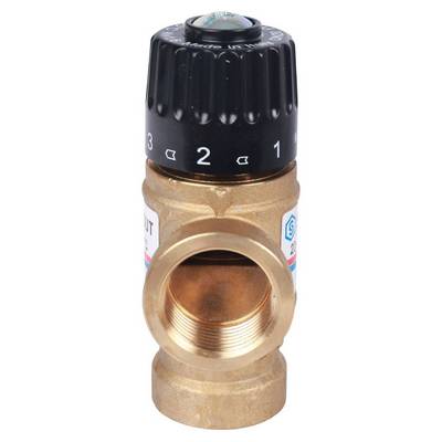 Смесительный термостатический клапан Stout имеет два входных штуцера для подвода смешиваемых сред и один выходной. В клапан встроен перенастраиваемый термостатический элемент, поддерживающий в зависимости от модификации клапана температуру теплоносителя в диапазонах 20 – 43 °С, 35 – 60 °С или 30 – 65 °С.