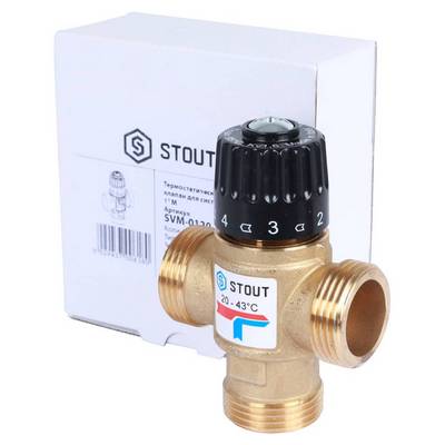 Смесительный термостатический клапан Stout имеет два входных штуцера для подвода смешиваемых сред и один выходной. В клапан встроен перенастраиваемый термостатический элемент, поддерживающий в зависимости от модификации клапана температуру теплоносителя в диапазонах 20 – 43 °С, 35 – 60 °С или 30 – 65 °С.