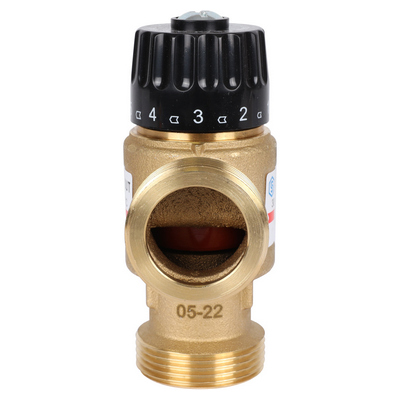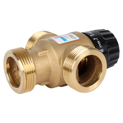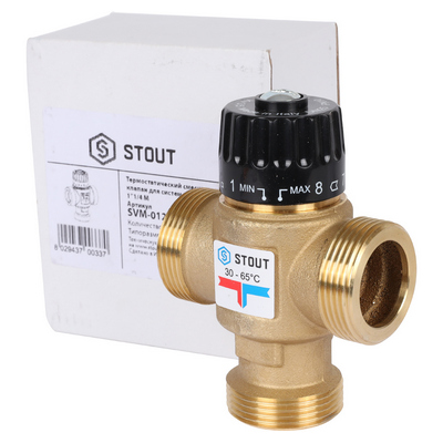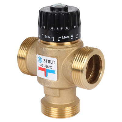 Смесительный термостатический клапан Stout имеет два входных штуцера для подвода смешиваемых сред и один выходной. В клапан встроен перенастраиваемый термостатический элемент, поддерживающий в зависимости от модификации клапана температуру теплоносителя в диапазонах 20 – 43 °С, 35 – 60 °С или 30 – 65 °С.