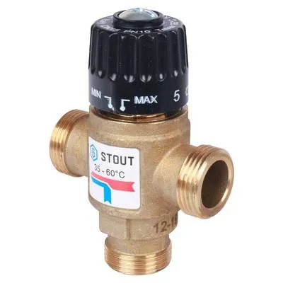 Смесительный термостатический клапан Stout имеет два входных штуцера для подвода смешиваемых сред и один выходной. В клапан встроен перенастраиваемый термостатический элемент, поддерживающий в зависимости от модификации клапана температуру теплоносителя в диапазонах 20 – 43 °С, 35 – 60 °С или 30 – 65 °С.