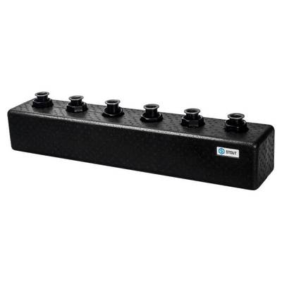 Распределительный коллектор Stout представляет собой одну стальную коробчатую трубу прямоугольного сечения, к которой снизу и сверху соосно приварены парные патрубки (входные и выходные). Внутри трубы выполнены фигурные перегородки для разграничения прямого и обратного потоков теплоносителя и организации распределения его между всеми выходными патрубками коллектора. Зигзагообразная форма перегородок позволяет расположить патрубки вдоль одной оси коллектора.