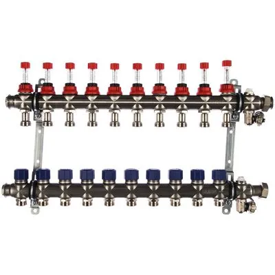 Коллекторная группа Elsen с регулирующими вентильными вставками М30х1,5 для термостатического либо электронного регулирования используется в системах отопления радиаторного типа или иных типов. Изделие комплектуется кранами Маевского для удаления воздуха из системы. Коллекторная группа поставляется в конфигурации от 2 до 12 контуров.