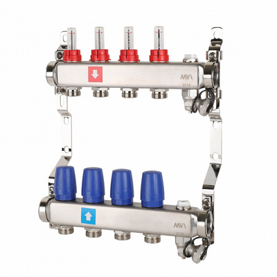 Коллекторный блок объединяет в себе подающий и обратный коллекторы из нержавеющей стали, ручные настроечные клапаны c расходомерами, термостатические клапаны (с возможностью установки электротермического сервопривода) и крепежные кронштейны.