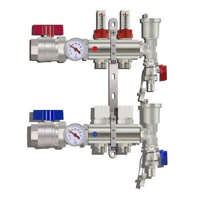 Коллекторная группа для теплого пола Tim предназначена для распределения теплоносителя по отдельным контурам системы теплого пола, обеспечивая сбалансированную подачу тепла каждому потребителю. С помощью этой гребенки можно дополнительно контролировать температуру как на подаче, так и на обратке, а также управлять количеством теплоносителя, проходящего в каждом отдельном циркуляционном кольце.