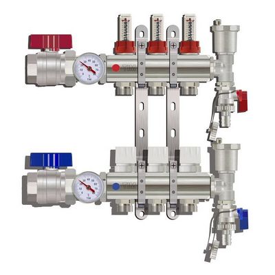 Коллекторная группа для теплого пола Tim предназначена для распределения теплоносителя по отдельным контурам системы теплого пола, обеспечивая сбалансированную подачу тепла каждому потребителю. С помощью этой гребенки можно дополнительно контролировать температуру как на подаче, так и на обратке, а также управлять количеством теплоносителя, проходящего в каждом отдельном циркуляционном кольце.