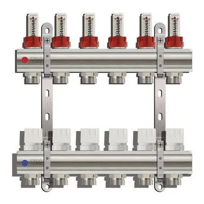 Коллекторная группа для теплого пола Tim латунная с расходомерами предназначена для распределения теплоносителя по контурам теплого пола. Коллектор имеет ручную регулировку с возможностью установки сервоприводов с резьбой М30х1,5 для управления теплым полом с помощью автоматики (программатор, термостат).