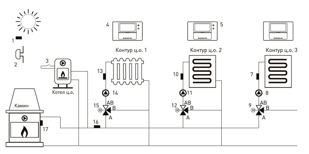 - Управление тремя контурами отопления с помощью смесительных клапанов (например, радиаторное отопление или тёплый пол);