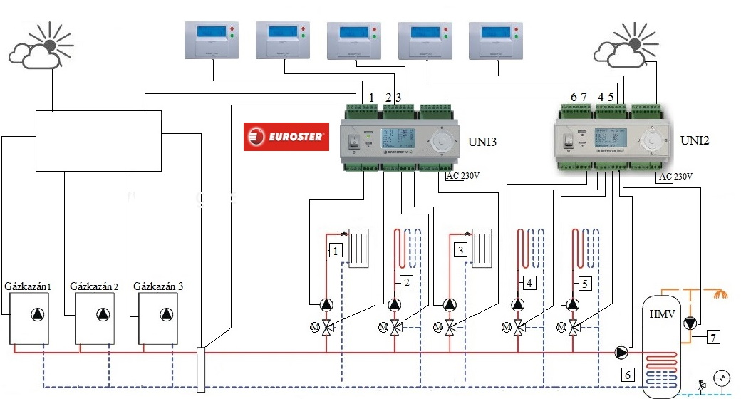 Контроллер отопления Euroster UNI3 – это универсальный погодный контроллер для независимого управления отопительными установками с 2-мя источниками тепла и 3-мя отопительными контурами со смесительными клапанами (например, радиаторное отопление или тёплый пол).