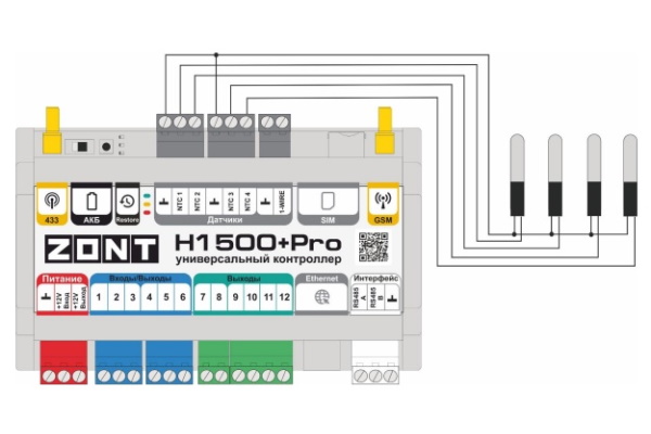 - Zont H1500+ PRO оснащен множеством входов и выходов для подключения различных датчиков и исполнительных механизмов. Это включает в себя датчики температуры, влажности, давления, а также устройства управления насосами, вентиляторами и другими исполнительными механизмами. Такая универсальность позволяет использовать контроллер для управления сложными инженерными системами.