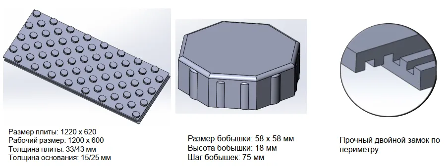 - Быстрый монтаж: благодаря фиксирующим бобышкам и замку по периметру. Разметка с обеих сторон упрощает раскройку и укладку.