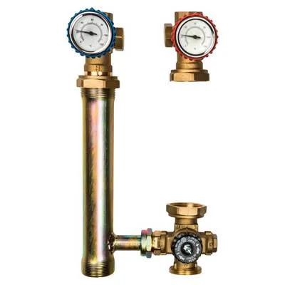 Со стороны системы теплопотребления все насосные группы снабжены запорными шаровыми кранами, совмещенными со стрелочными термометрами. На возвратной линии шаровой кран совмещен с обратным клапаном. Насосные группы DN 25 (SDG-0002-002501, SDG-0002-002502, SDG0002-002503) имеют штуцеры для установки байпасного перепускного клапана.