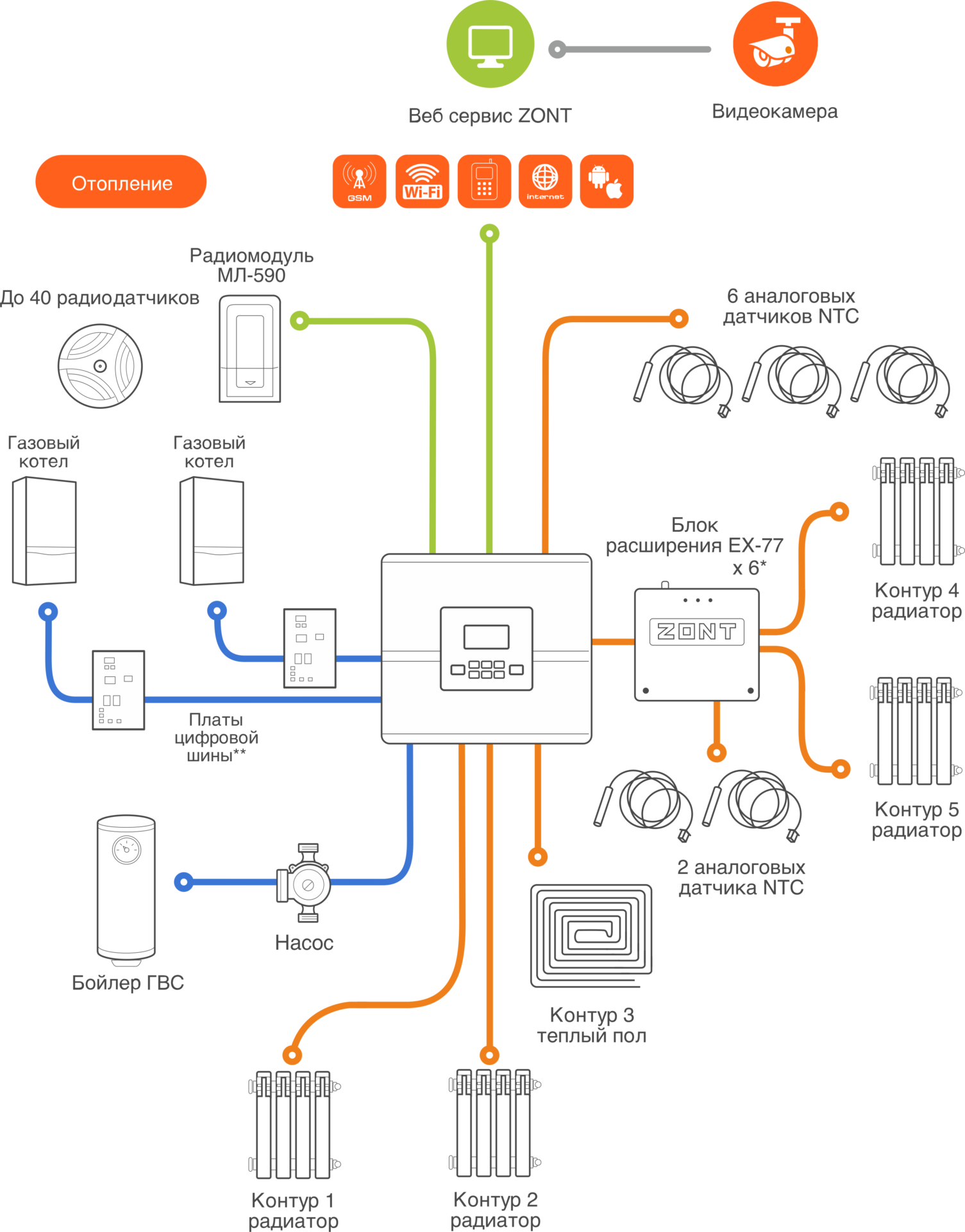Регулятор ZONT Climatic 1.3 позволяет автоматизировать и управлять комплексной отопительной системой, включающей 1 контур ГВС и 3 прямых/смесительных контура. ZONT Climatic 1.3 позволяет расширить систему до 15 прямых/смесительных контуров за счет подключаемых блоков расширения (один блок дает 2 дополнительных контура).