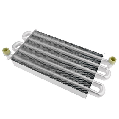 Теплообменник изготовлен из меди с ребристой поверхностью, что увеличивает площадь теплообмена и обеспечивает высокую эффективность передачи тепла. Медная конструкция гарантирует долговечность и надежность в эксплуатации.