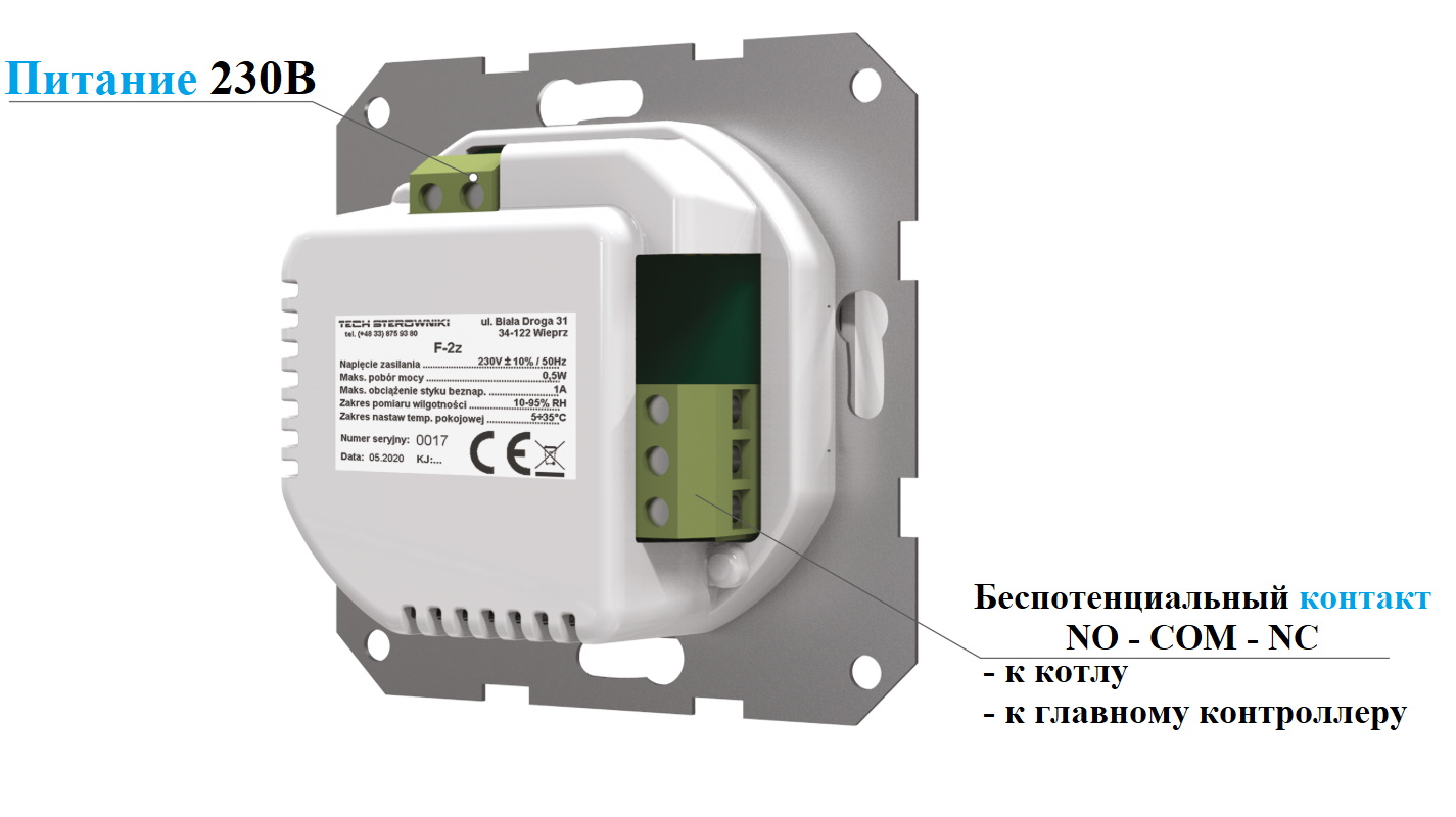 Проводной комнатный терморегулятор Tech F-2z v1 предназначен для поддержания комфортной температуры воздуха в помещении.