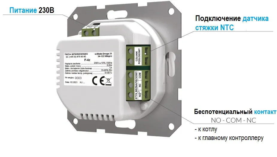 Проводной комнатный терморегулятор Tech F-4z v1 предназначен для поддержания комфортной температуры воздуха в помещении.