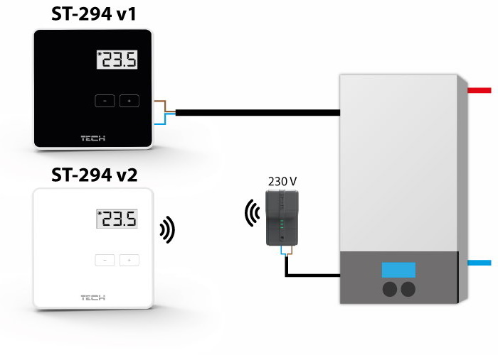 Принцип действия Tech ST-294v1 ничем не отличается от традиционных термостатов – устройство просто включает или выключает отопительный котёл (газовый, электрический) с помощью беспотенциального (сухого) контакта.